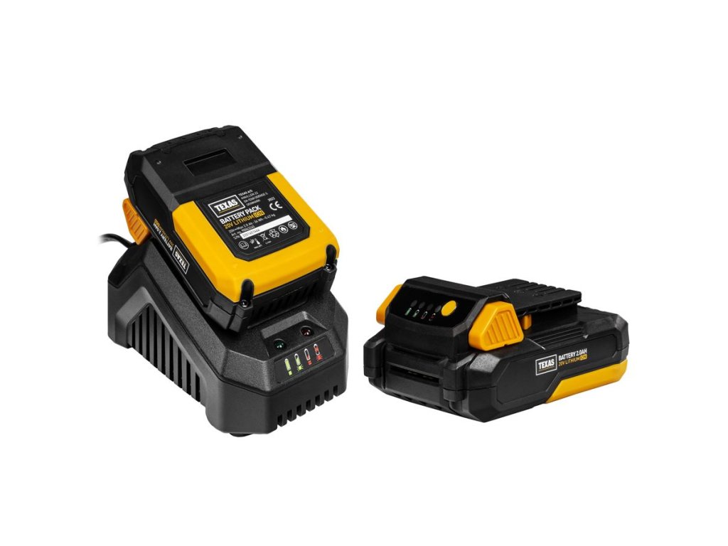 V balení sa nachádzajú 2× 20 V / 2,0 Ah batérie a rýchlonabíjačka (1 hodina na batériu). Kosačka vyžaduje použitie oboch batérií súčasne, aby sa dosiahol plný výkon. Batérie sú kompatibilné s ďalšími strojmi série TEXAS 20V.
