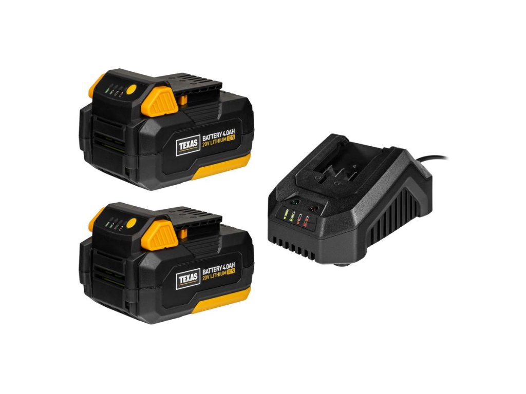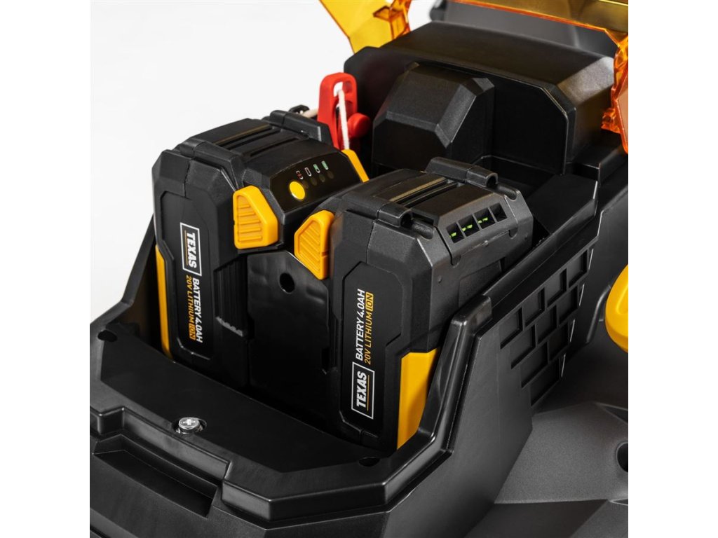 Kosačka používa dve batérie súčasne, aby bol zabezpečený plný výkon. Dodávané akumulátory a nabíjačka sú kompatibilné s ďalšími strojmi TEXAS 20V série, takže ich môžete využiť aj pri vyžínači, plotostrihu, píle či fukári.