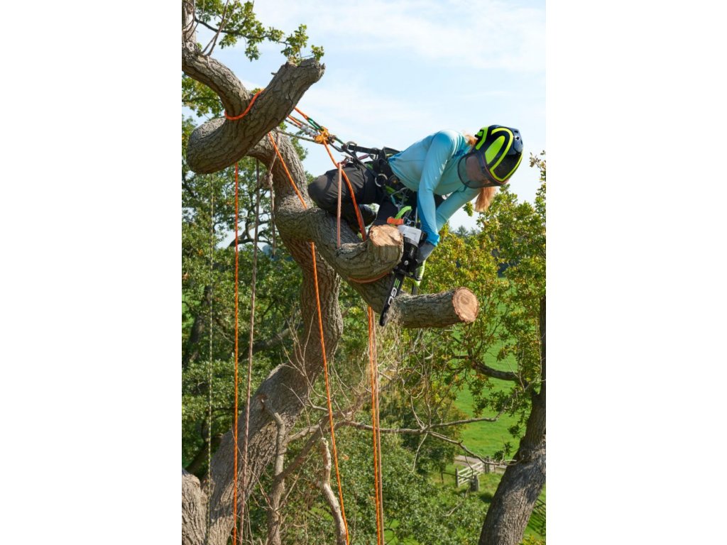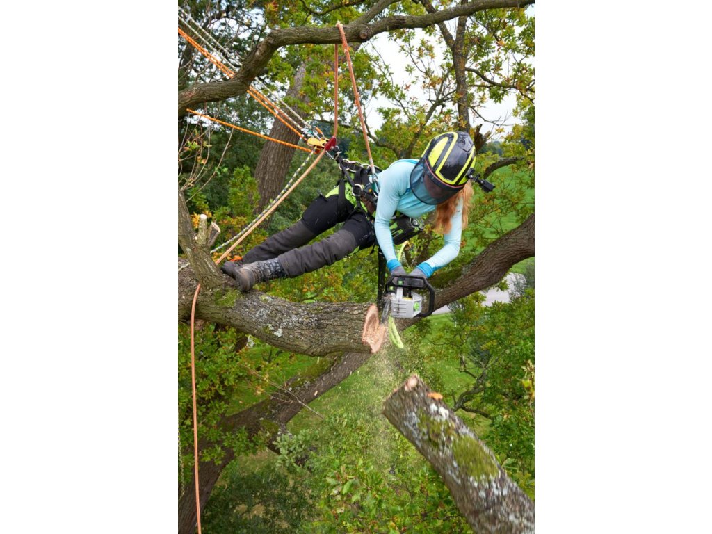 - Opaskový nosič umožňuje batériu a pílu bezpečne uchytiť na lezecký postroj alebo bezpečnostný opasok