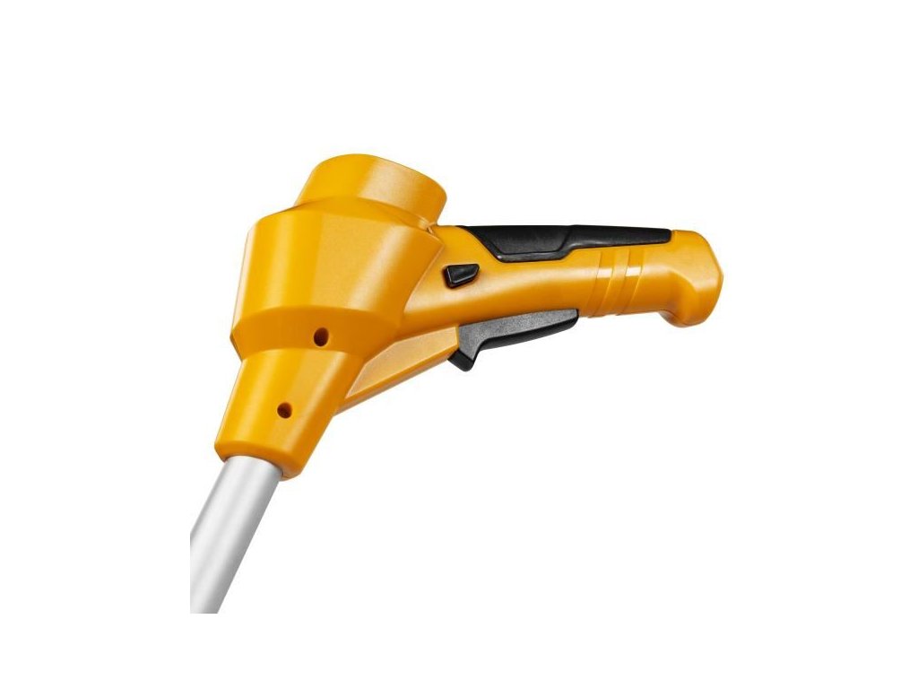 GT1080 má teleskopickú rukoväť s nastaviteľnou dĺžkou, takže si ho ľahko prispôsobíte vlastnej výške. Na rozdiel od tradičných strunových vyžínačov používa plastové nože, ktoré sú tichšie, účinnejšie a ich výmena je maximálne jednoduchá – stačí zacvaknúť nový nôž a pokračovať v práci. Plastové nože majú zároveň menšie opotrebenie a nezamotávajú sa ako struna.