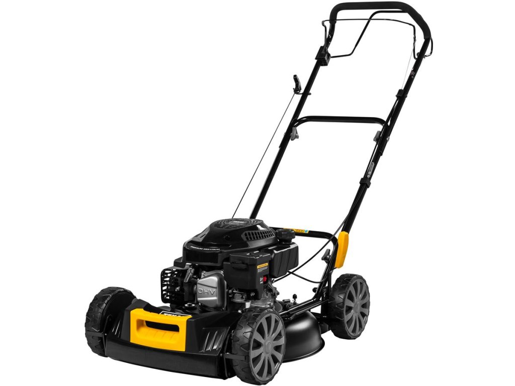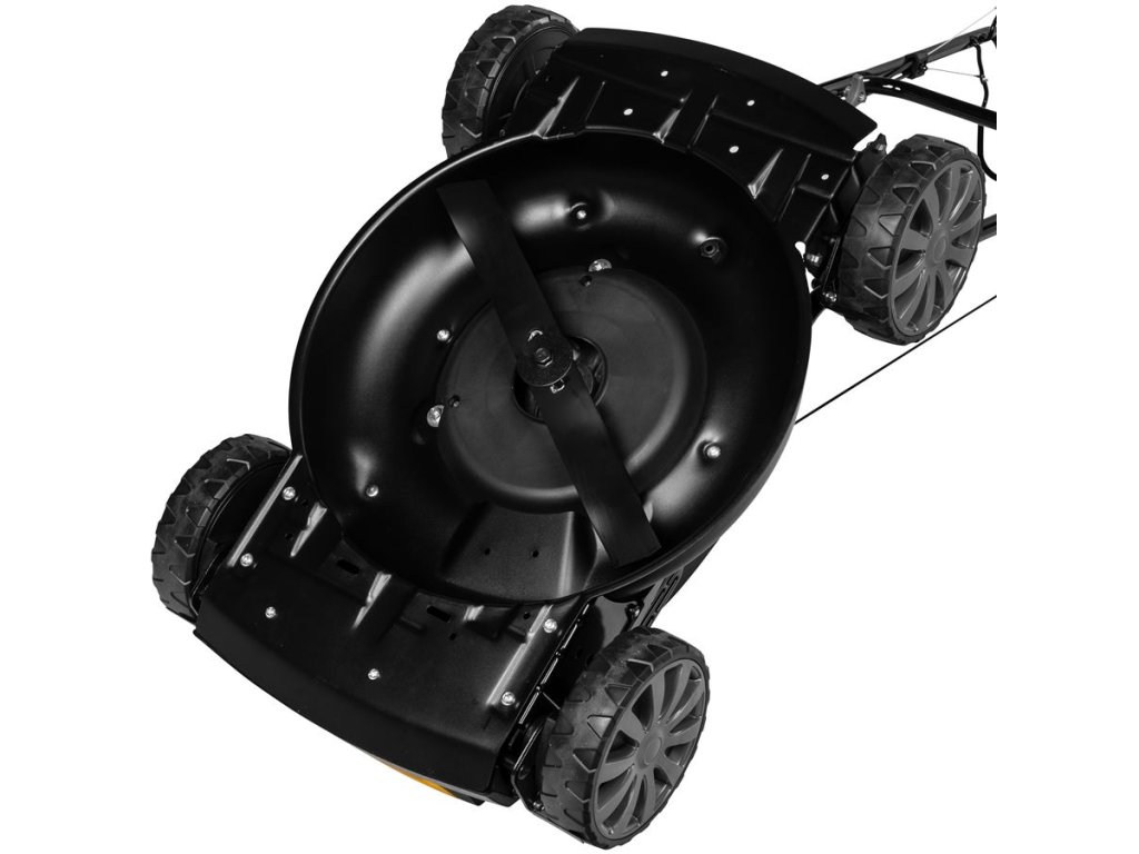 Robustný oceľový žací štít s hrúbkou 2,5 mm, vyrobený z jedného kusu kovu bez zvárania, zaisťuje vysokú pevnosť a optimálne prúdenie trávy pod kosačkou. Šírka kosenia 48 cm umožňuje rýchlu a efektívnu prácu aj na väčších plochách.