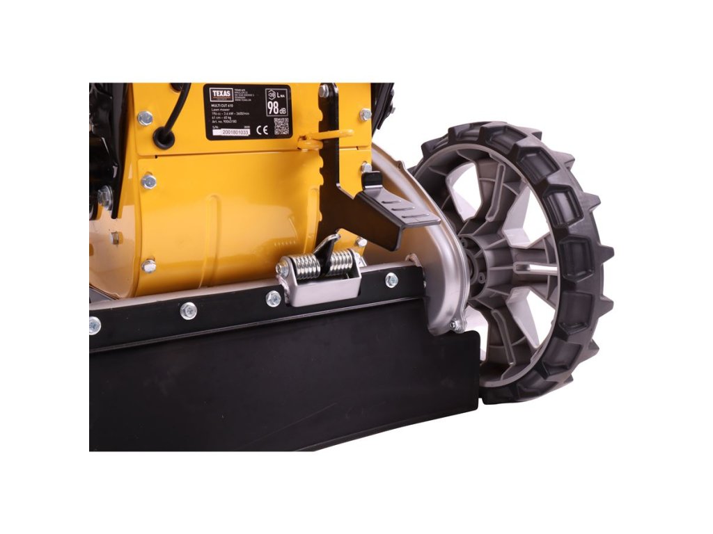 Kosačka pracuje so širokým záberom 61 cm a bočným vyhadzovaním, čo výrazne zrýchľuje postup pri kosení veľkých plôch. Výšku kosenia nastavíš jednoducho nožným pedálom v rozsahu 25–75 mm, pričom predné otočné koleso má 4 polohy, ktoré sa dajú rýchlo meniť bez použitia náradia.