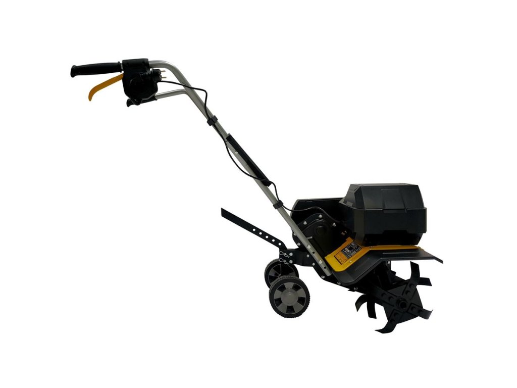 Súčasťou je kombinované hĺbkové klzné a transportné koleso, ktoré je možné preklopiť podľa potreby. Robustné transportné kolesá uľahčujú manipuláciu a presun stroja. Bezpečnostný spínač a spojková rukoväť zabezpečujú jednoduché a bezpečné ovládanie. Bočné chrániče obmedzujú vyhadzovanie pôdy počas práce.