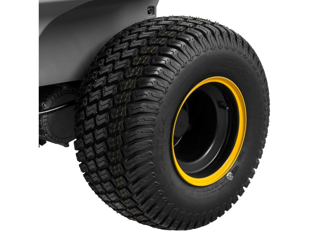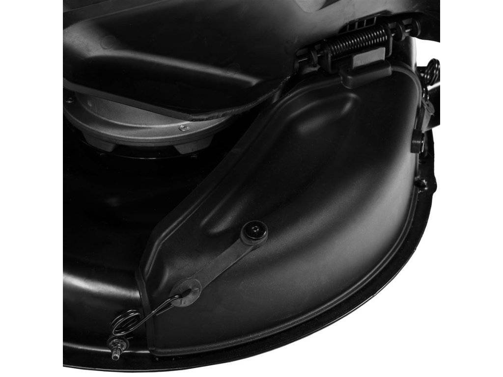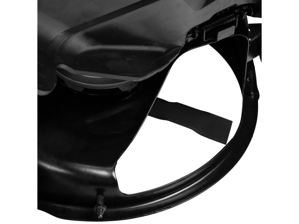 Pod širokým 96 cm oceľovým žacím ústrojenstvom pracujú dva precízne nože, ktoré kosia rýchlosťou až 3800 ot./min.To zabezpečuje čistý a presný strih pri mulčovaní aj bočnom vyhadzovaní. Vďaka 7-stupňovému centrálnemu nastaveniu výšky môžete kosiť od nízkych 38 mm až po vysokých 114 mm – ideálne pre udržiavané trávniky aj prerastené plochy. Súčasťou sú aj skalperové bočné kolieska, ktoré chránia trávnik pred poškodením na nerovnom teréne.