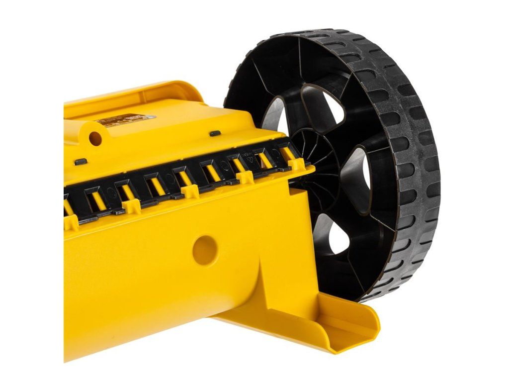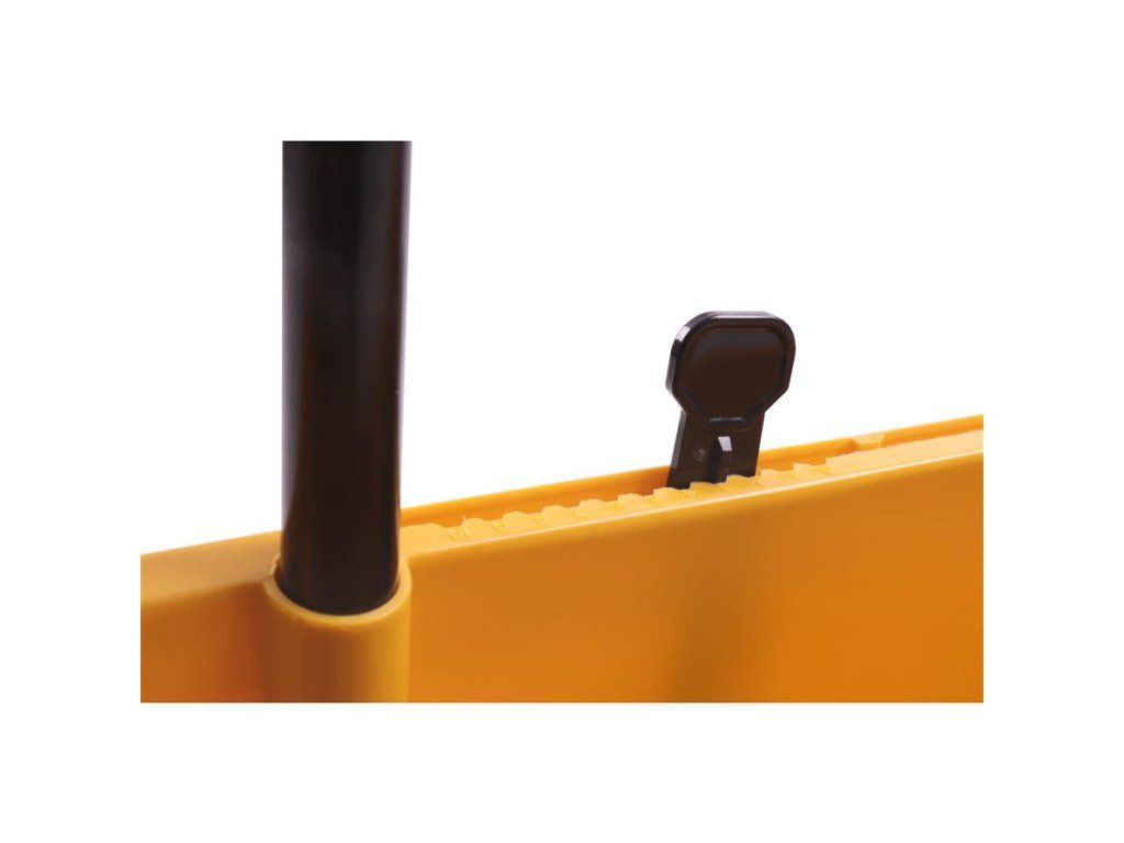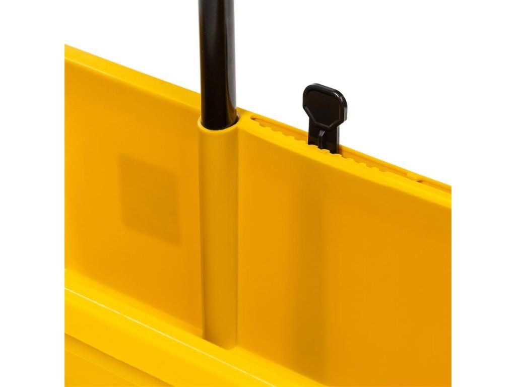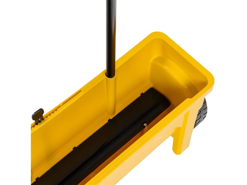 Konštrukcia z oceľových rúrok zabezpečuje pevnosť, zatiaľ čo 12-litrová plastová nádoba ponúka dostatočný objem na základné práce bez častého dopĺňania.