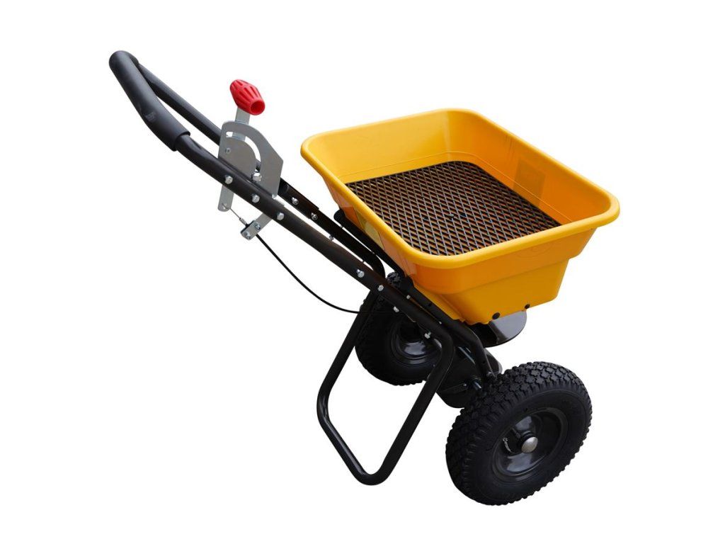 Odstredivý systém zabezpečuje rovnomerný rozptyl materiálu do šírky až 2 metre. Stačí vozík tlačiť pred sebou a obežné koleso automaticky rozmetá soľ, piesok, hnojivo alebo trávne osivo.