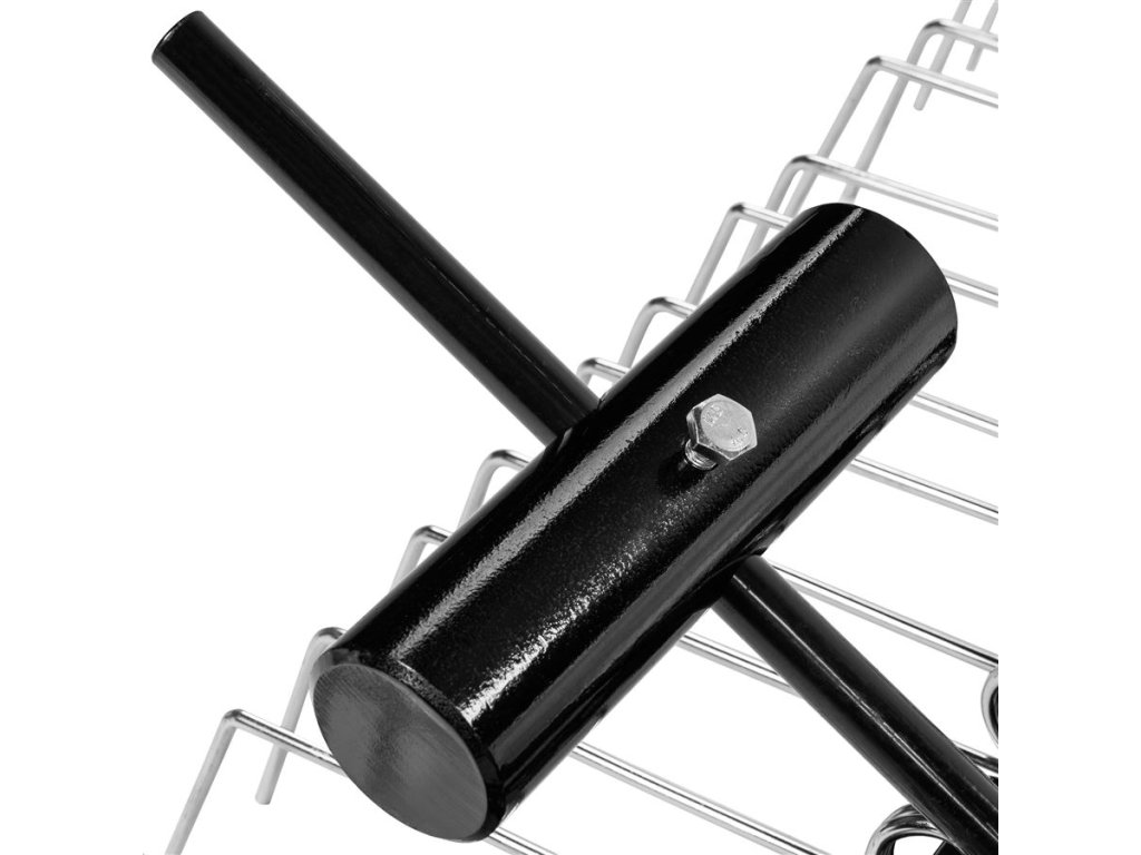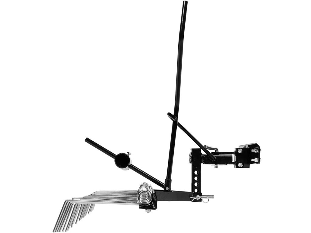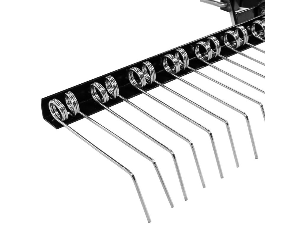 Konštrukcia obsahuje 2 × 15 silných kovových zubov, ktoré zabezpečujú účinný zber materiálu a spoľahlivú prevádzku. Pre montáž je potrebné prispôsobenie na konkrétny záhradný traktor, keďže hrable nie je možné pripojiť na štandardné ťažné zariadenie.