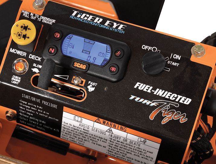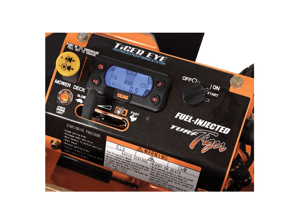 SLEDUJTE DÔLEŽITÉ FUNKCIE SYSTÉMU V REÁLNOM ČASE V závislosti od modelu kosačky a výberu motora monitoruje pokročilý monitorovací systém Tiger Eye™ širokú škálu systémov v reálnom čase a poskytuje vám cenné informácie jednoduchým pohľadom priamo zo sedadla vodiča. |